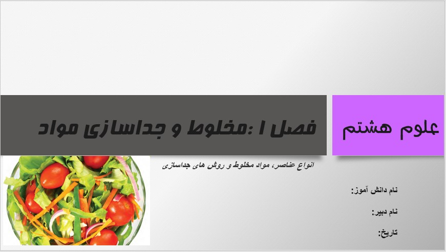 این پاورپوینت به آموزش فصل اول علوم تجربی پایه هشتم یعنی تجربه و تفکر می پردازد و سعی شده است با استفاده از تصاویر زیبا و طراحی جذاب یادگیری را لذت بخش بگرداند.